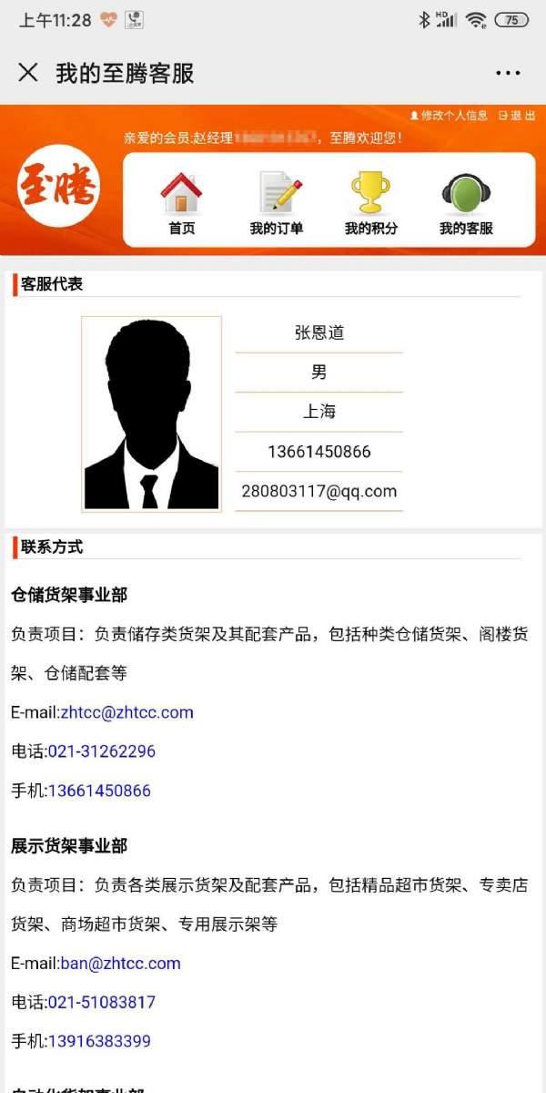 【我的客服】,展现会员最后一次下订单时的服务人员的详细信息。